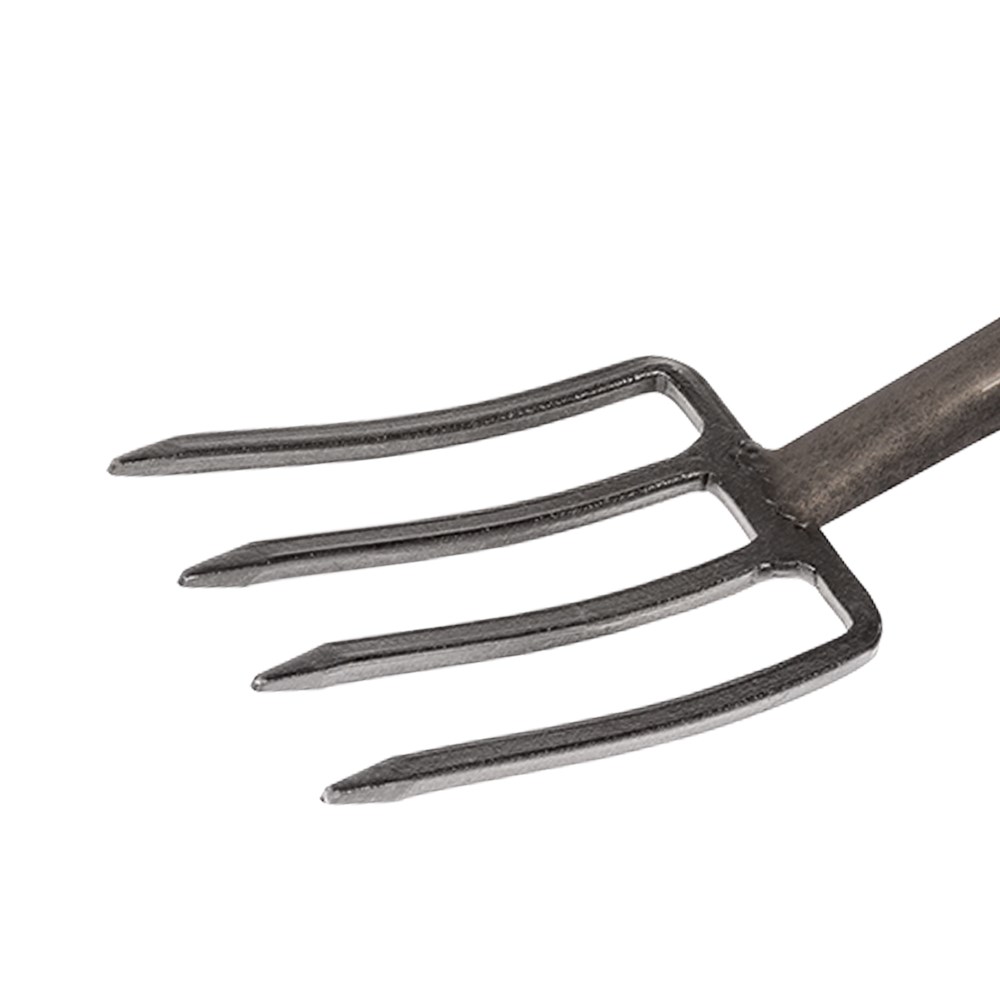 Met robuuste, warmtebehandelde tanden en een met staal versterkte Power Ring-houder biedt hij de kracht van veel grotere vorken met het gemak van een kortere steel.
