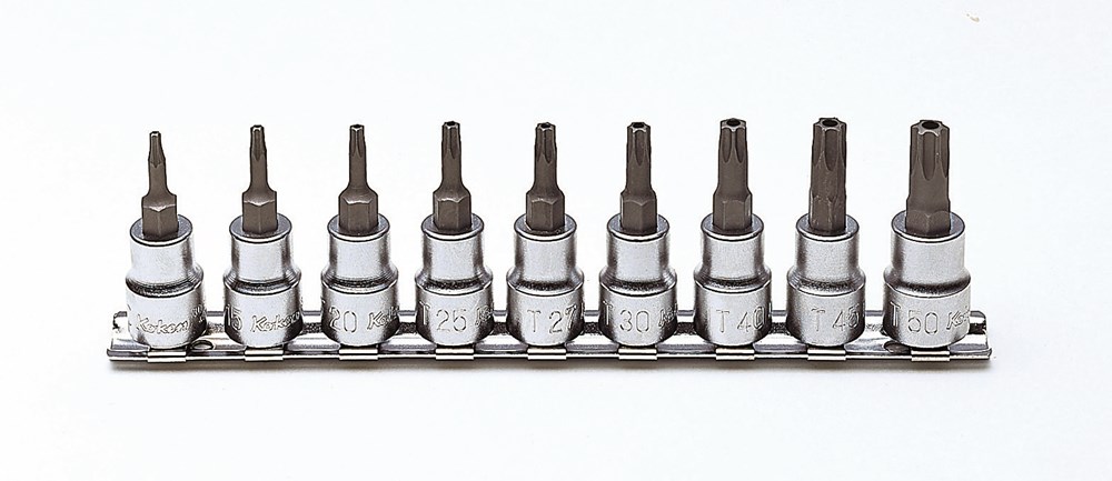 9 delige set 3/8" torx schroevendr.dop T10H-T50H met gat, op rail, L=50mm